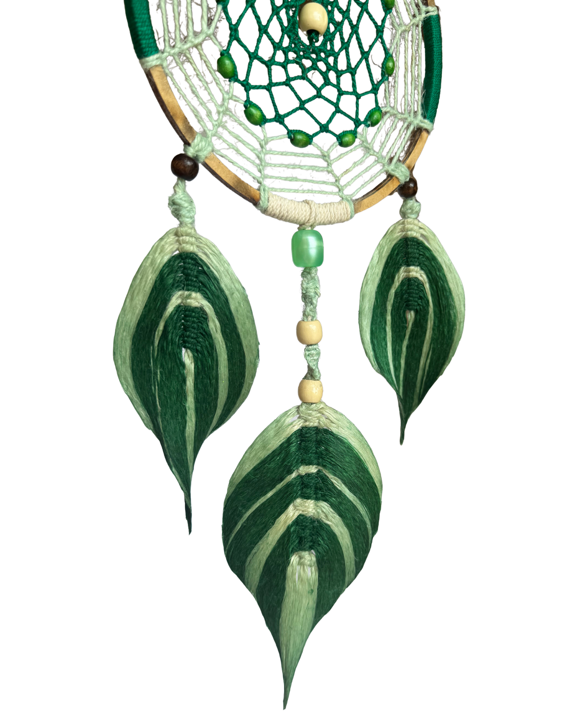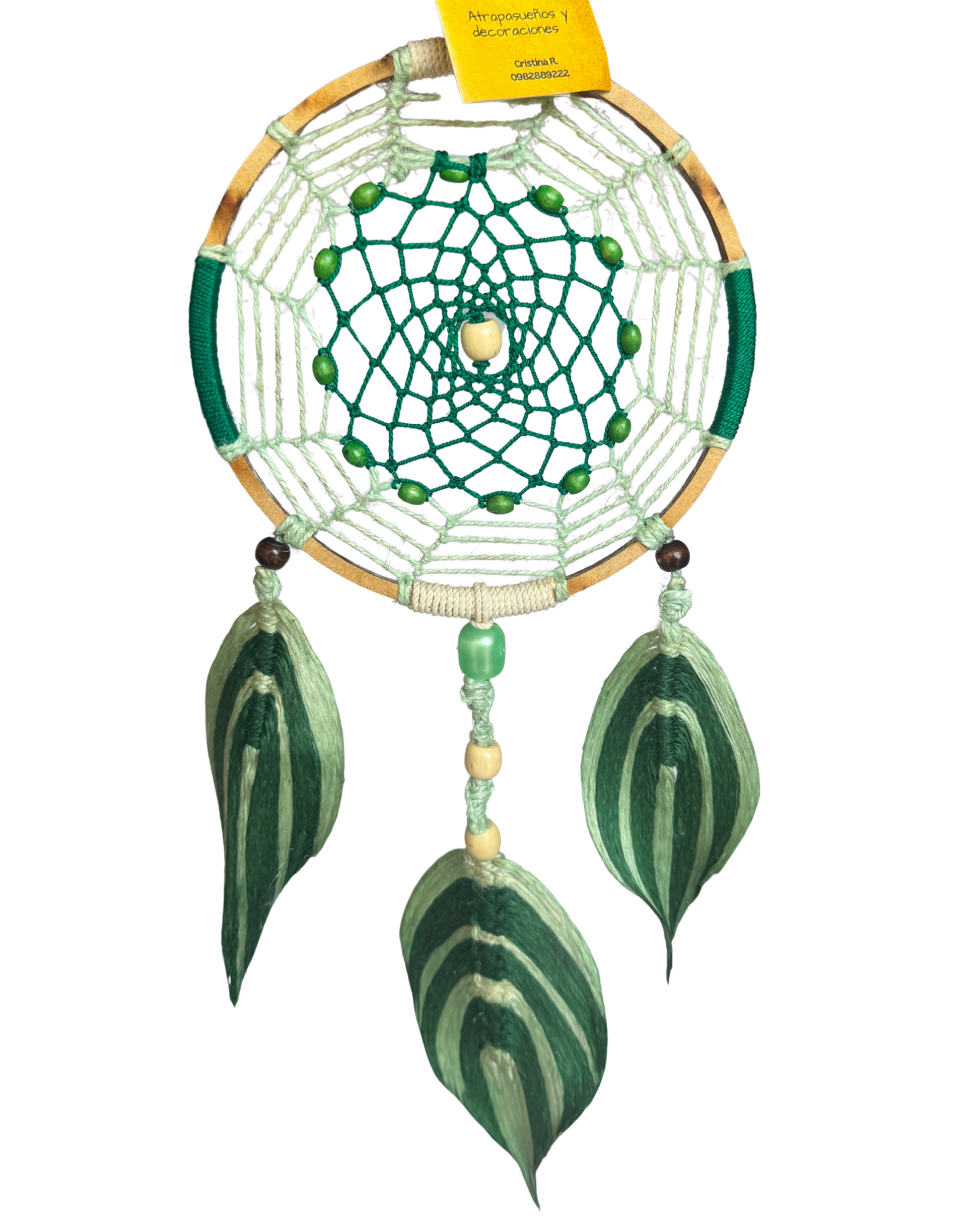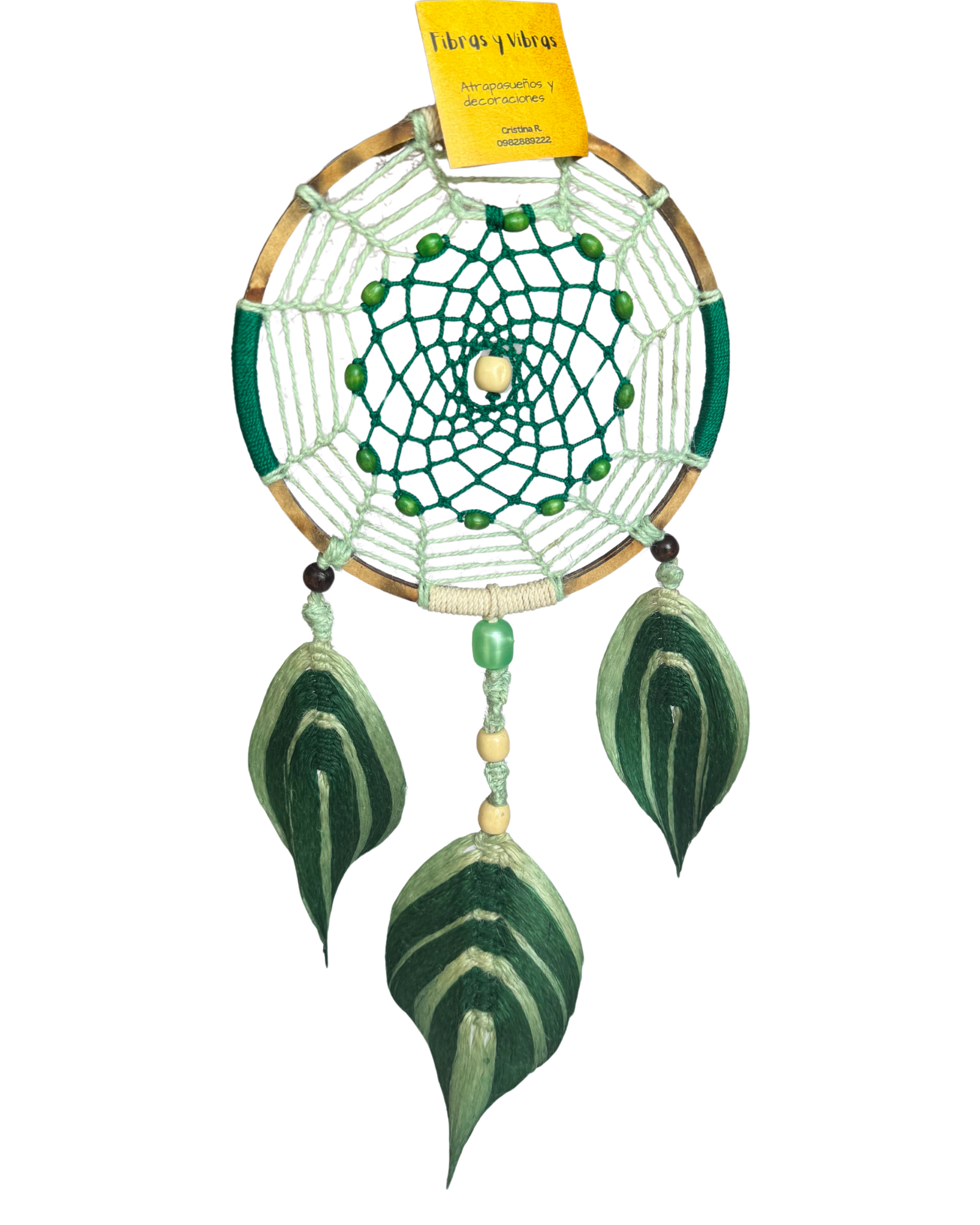 Hecho a mano en aro de madera forrado en verde y blanco, con tejido central en dos tonos de verde y decorado con cuentas de madera. Finalizado con tres plumas en yute tejido en macramé, transmite frescura y sanidad al espacio donde lo coloques. Una pieza artesanal amazónica única.