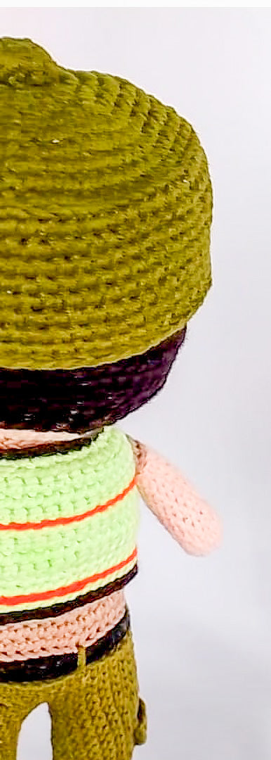 Este adorable personaje está tejido 100% a mano en punto bajo, con hilos de algodón de alta calidad y detalles cuidadosamente elaborados que lo convierten en un regalo ideal para niños, coleccionistas o amantes de lo hecho a mano. Viene con accesorios removibles como su chaleco y gorra, lo que permite jugar y personalizar la experiencia. Su base de madera reciclada y relleno de plumón suave lo hacen no solo sostenible, sino también muy agradable al tacto y a la vista.