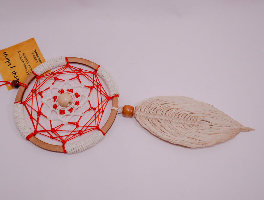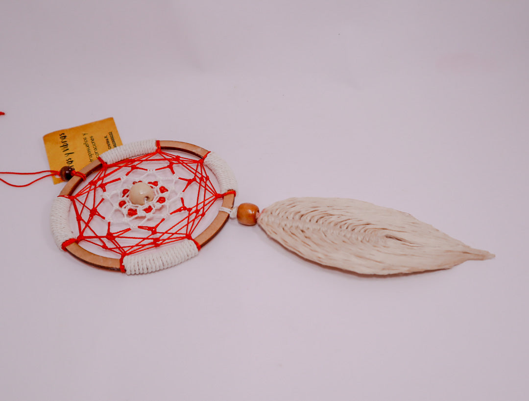 Diseño artesanal en tonos claros, principalmente rojo y blanco, con delicadas plumas y cuerdas suaves. Las pepas decorativas aportan equilibrio y textura. Representa la pureza y la renovación del amanecer. Ideal para decorar habitaciones, entradas o espacios donde se busca paz y luminosidad.