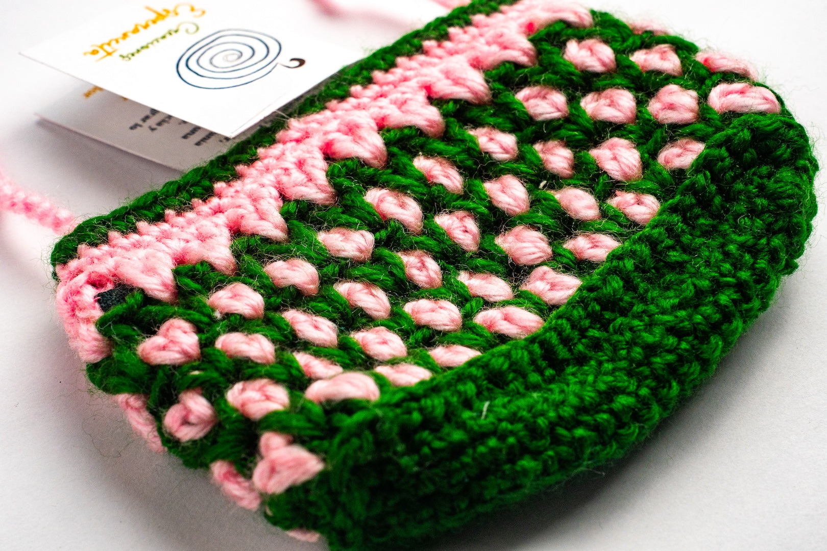 Bolso monedero en verdes y rosas, confeccionado con hilos de alta calidad. El verde simboliza frescura y renovación, y el rosa dulzura y creatividad. Este accesorio combina elegancia y originalidad, es versátil para cualquier atuendo, y cuenta con un diseño distintivo, cierre seguro e interior amplio para llevar lo esencial con estilo, ideal para expresar la personalidad.