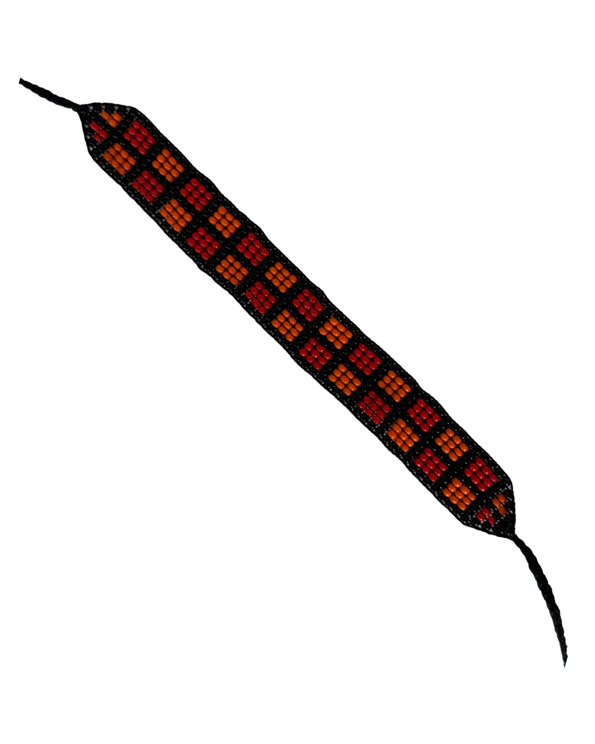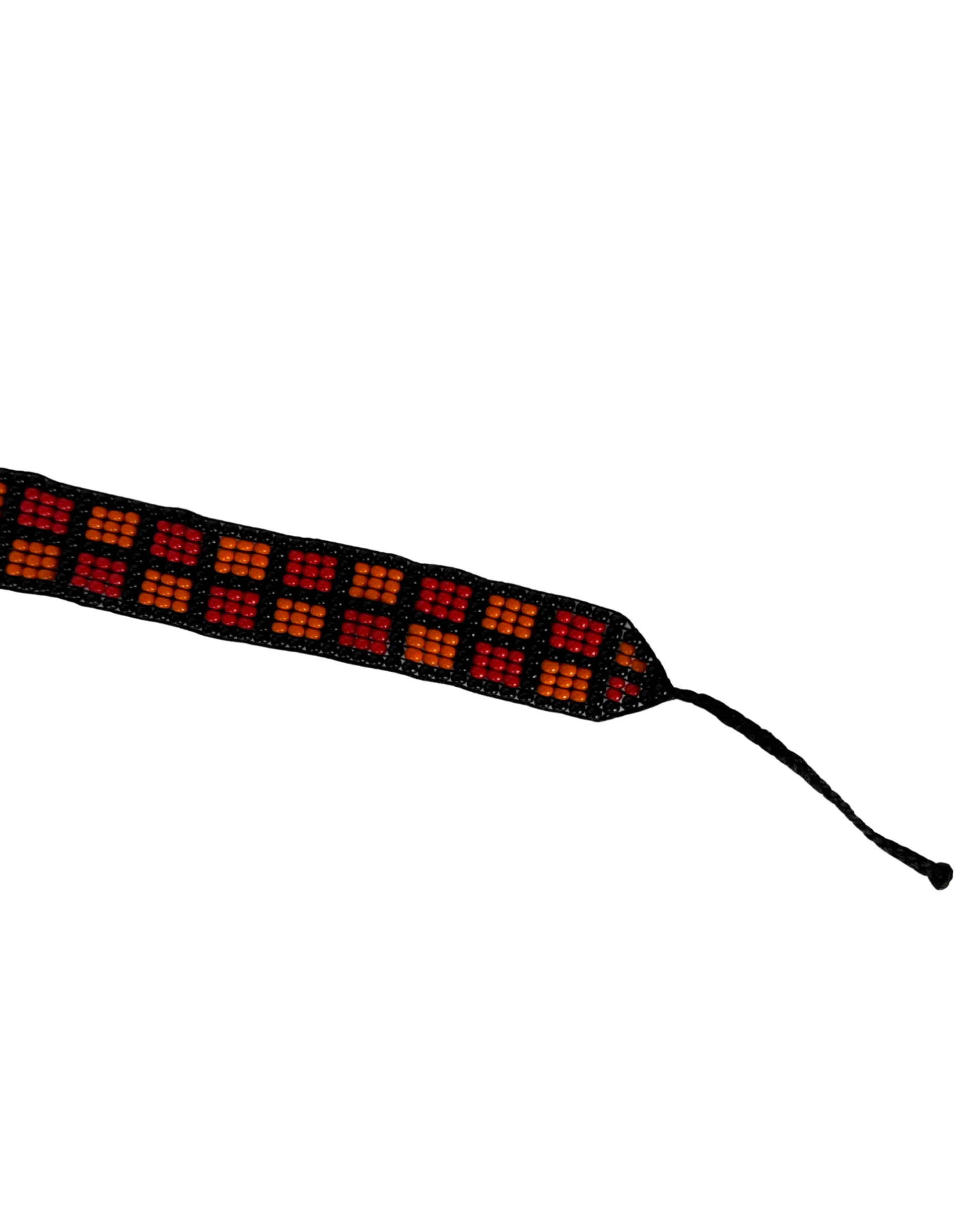 Brazalete con figuras coloridas geométricas sobre fondo negro. Cada figura ha sido cuidadosamente diseñada para resaltar con vivos tonos que contrastan elegantemente con el fondo oscuro. Este brazalete es una pieza única, ideal para quienes buscan añadir un toque de arte contemporáneo a su colección de accesorios.