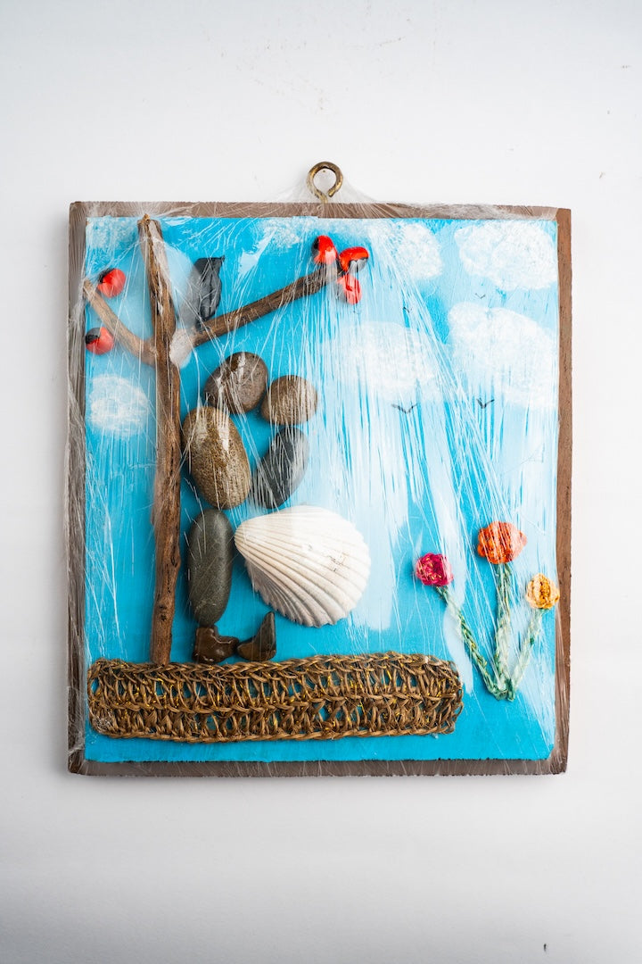 La belleza natural con la sostenibilidad. Decorado con piedras, semillas, hilos y una concha sobre un fondo celeste, cada elemento ha sido cuidadosamente colocado para crear una pieza armoniosa y llena de significado. El toque de madera reciclada no solo aporta carácter, sino también un compromiso con el medio ambiente.