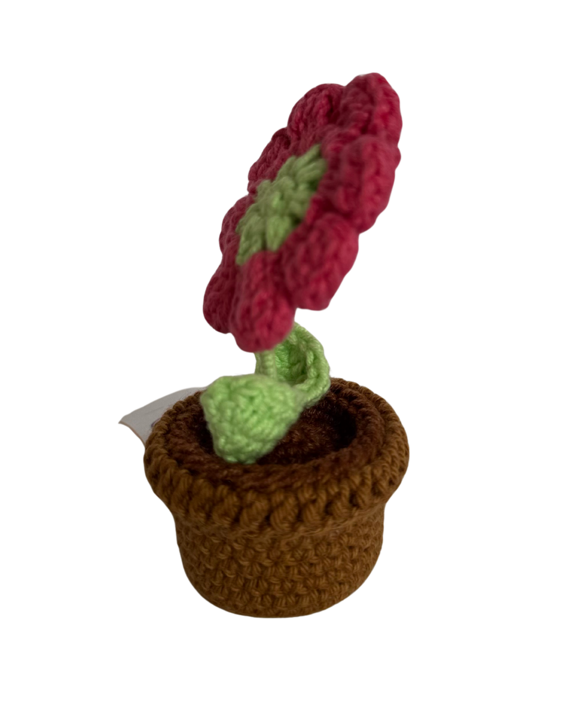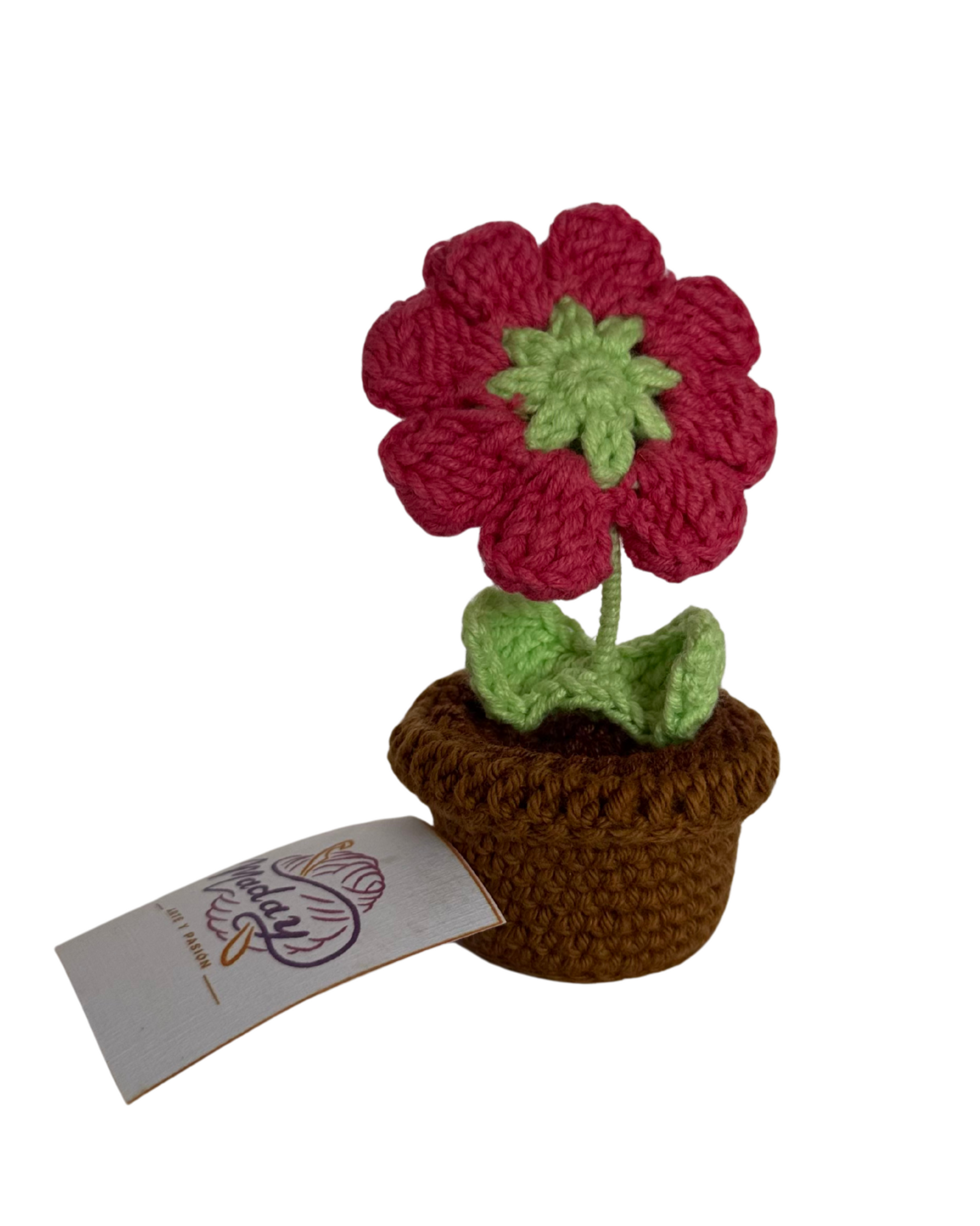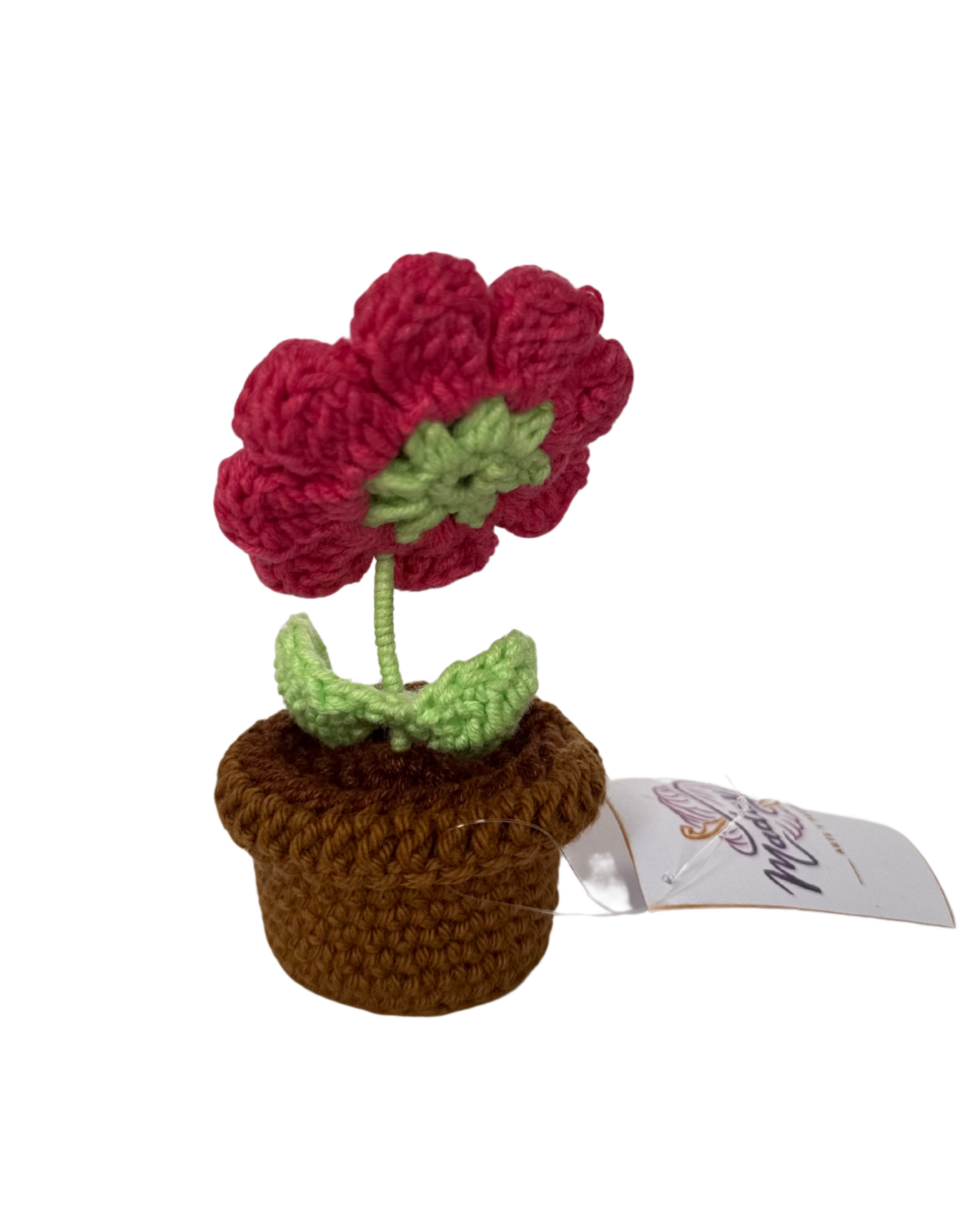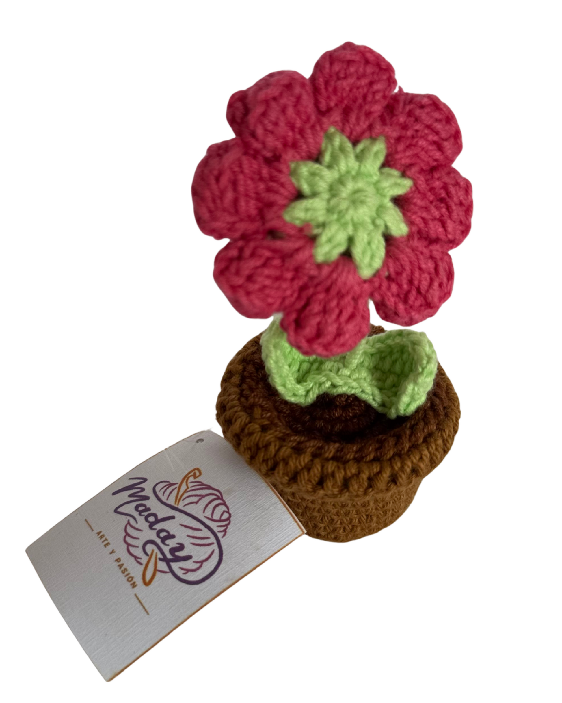 La Flor Rous es una pieza artesanal tejida con dedicación en punto alto, utilizando hilo de algodón en un vibrante tono fucsia. Su estructura incorpora alambre reciclado y piedras en la base, lo que la convierte en una flor firme, duradera y visualmente encantadora.