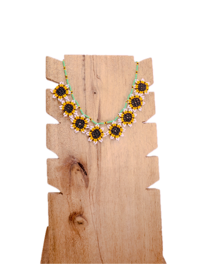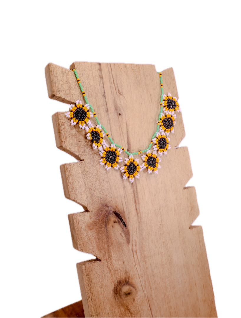 Collar en colores verde, blanco, negro y amarillo, que cambia de tonalidad en torno a una figura de planta formada por pepas. Representa el crecimiento, la fertilidad y el poder sanador de la Pachamama. Un homenaje a lo vivo que habita en lo ancestral.