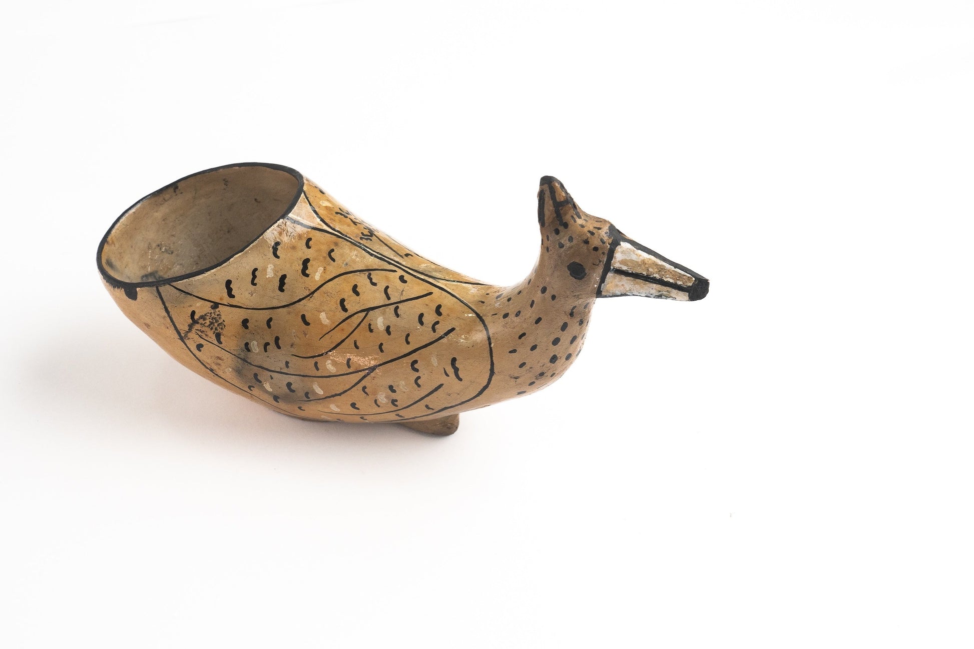 Figura tradicional Kichwa utilizada en fiestas para servir chicha. Representa una pava y es un objeto decorativo que simboliza la rica tradición artesanal.
