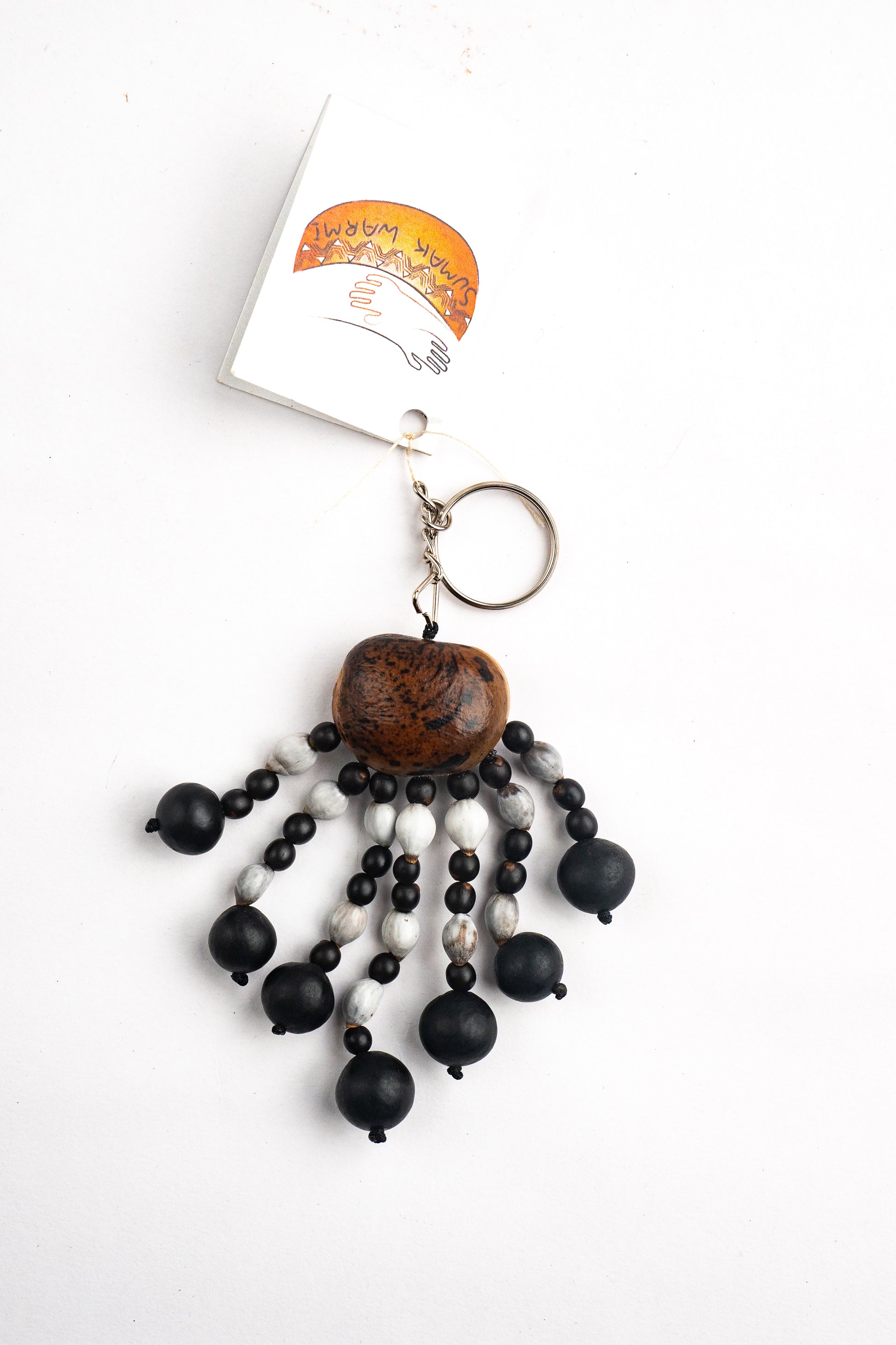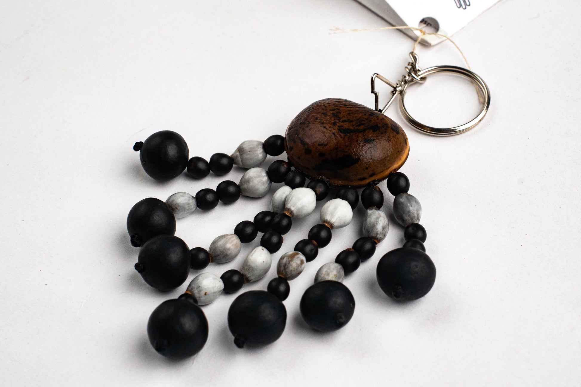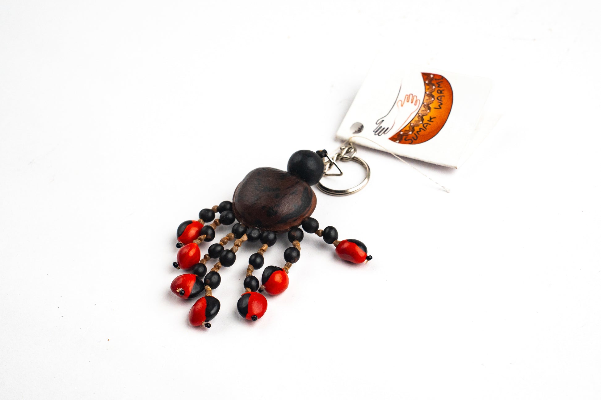 Llavero artesanal con semilla de ojo de buey y detalles en jaboncillo, lágrima de San Pedro y achira. Refleja riqueza cultural y conexión con la naturaleza. Las semillas son duraderas y el aro de acero añade un toque moderno. Ideal para quienes valoran el arte y la tradición, es un homenaje a la biodiversidad y al patrimonio cultural, para llevar siempre contigo.