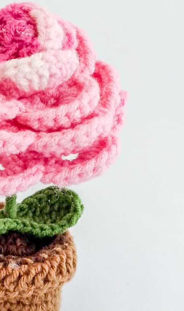 Rosa Roxana es una joya artesanal elaborada 100% a mano por mujeres emprendedoras que tejen con dedicación, creatividad y propósito. Esta rosa única combina hilos de algodón en tonos rosados matizados, alambre reciclado y detalles encantadores como pétalos múltiples, hojas y maceta, cuidadosamente elaborados en punto alto y punto bajo.