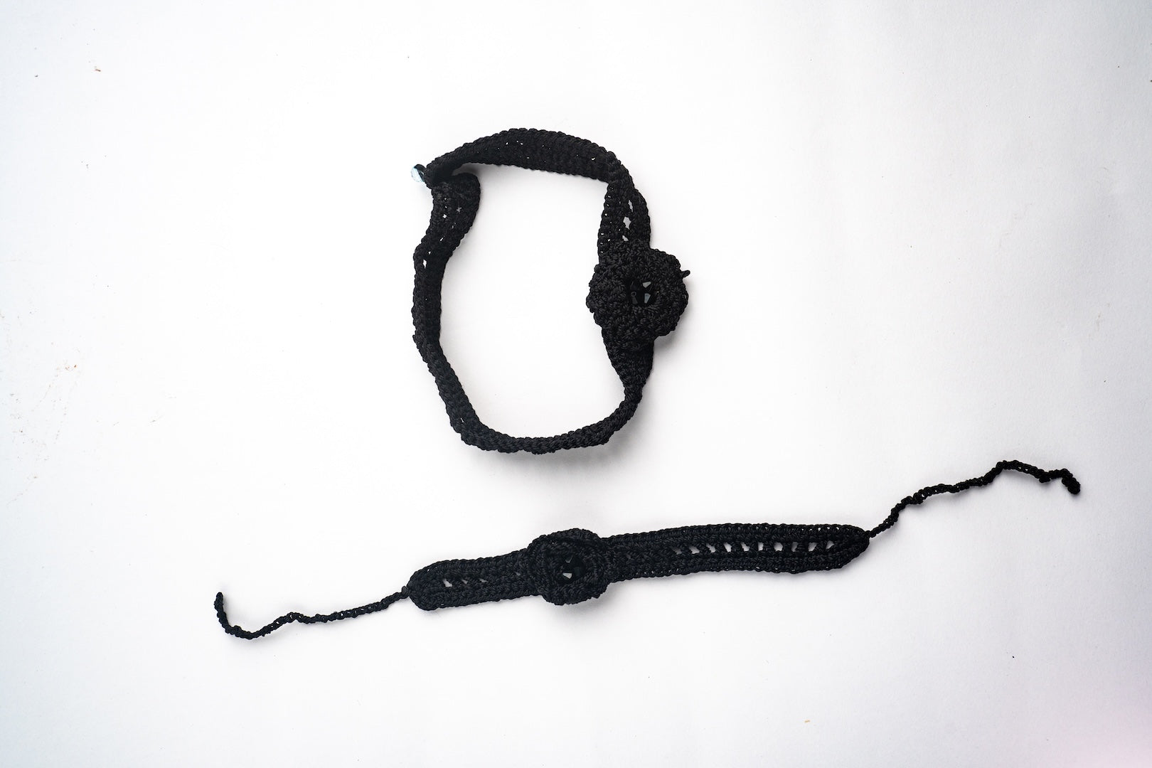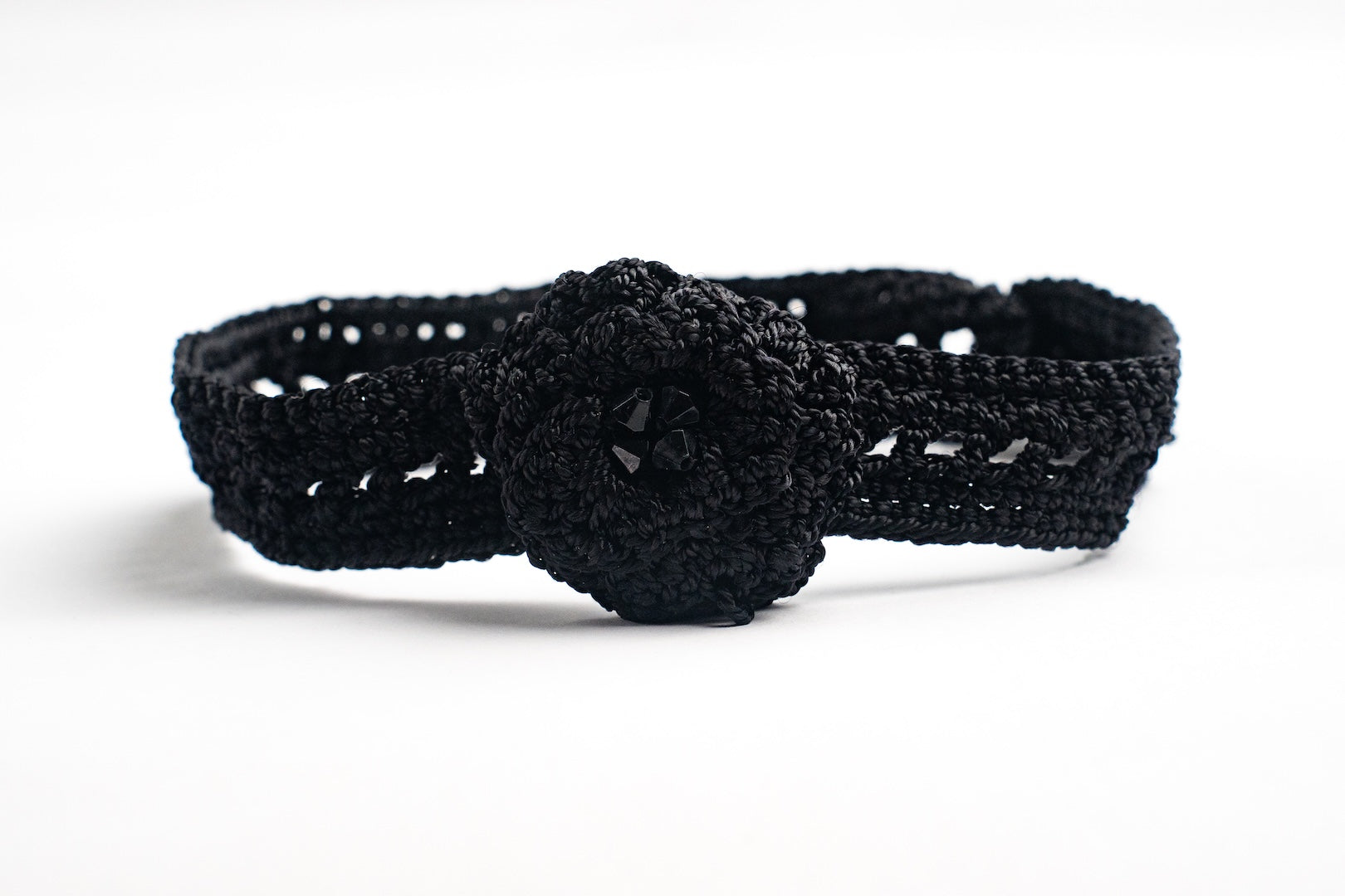 Gargantilla y pulsera tejida en crochet negro con flor y piedritas. Este conjunto artesanal combina elegancia y estilo, ideal para cualquier atuendo. Elaborado a mano, presenta un delicado patrón y un detalle encantador que aporta un brillo discreto. Perfecto para ocasiones especiales o uso diario, refleja arte y dedicación en su creación.
